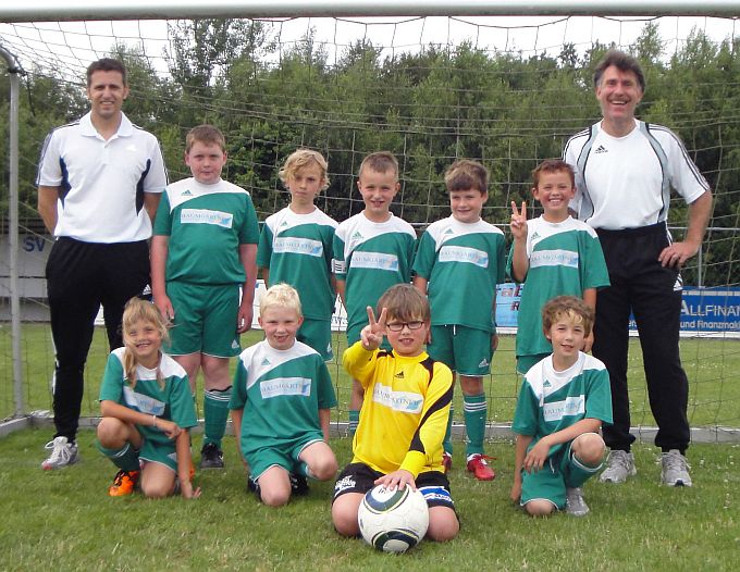 Die stolzen Turniersieger: unten v. l.: Annika Urlberger, Lucas Ecker, Lukas Grabner, Benedikt Späth — stehend v. l.: Co-Trainer Hartmut Hölzl, Jonas Woletz, Samuel Kronschnabel, Maximilian Hölzel, Benedikt Steinbuchner, Ryan Jertila, Trainer Sepp Doriat