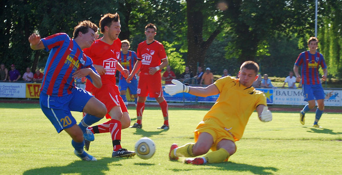 Einen auch dieser Höhe völlig verdienten 4:0-Sieg fuhr die SpVgg Osterhofen-Altenmarkt gegen den SV Auerbach ein. Die Partie begann von beiden Teams sehr verhalten. Den ersten Aufreger lieferten die Gäste ab als Franz Huber in der 10. Minute frei zum Kopfball kam. TW Winnerl wehrte ab und stand dann auch beim Nachschuß auf dem Posten. Matthias Bauer schoss in der 14. Minute erstmals für Osterhofen auf das Auerbacher Tor. Bauer verfehlte deutlich das Ziel. Die erste nennenswerte Aktion führte in der 17. Minute zur Führung für die Hausherren. Eine von Markus Tippelt getretene Ecke versenkte Thomas Saller mit dem Kopf. Die Gäste waren nach der Führung sichtlich geschockt. Unerklärlich traten dann die noch voll im Abstiegskampf steckenden Auerbacher auf. Ohne Biss und Plan spielten sich die Gäste die Bälle zu, ohne jegliche Torgefahr zu entwickeln. Die Hauherren nahmen dieses Angebot großzügig an und suchten ihr Glück weiterhin in der Offensive. Die Oslislo-Elf schüttelte die Bürde der letzten Pleiten ab und spielte wieder den Fußball wir zu Beginn der Rückrunde. Dabei feuerten sie aus „allen Rohren“ und prüfte den besten Auerbacher, TW Pacal Keese, ein ums andere mal. Kurz vor dem Seitenwechsel hatte David Duraj, freistehend die große Möglichkeit zum 2:0. Keese parierte den zu ungenauen Schuß des Osterhofener Mittelfeldspielers. Der Nachschuß von Martin Oslislo war weitaus gefährlicher. Hier klärte Keese brillant. Nach dem Wechsel warteten die zahlreichen Auerbacher Schlachtenbummler ein Wende. Vergebens. Die Hausherren waren die dominierende Elf die weiter Akzente nach vorne setzte. Der sehr agile David Duraj konnte immer wieder über die rechte Seite durchbrechen. In der 53. Minute schloss er einen herrlich herausgespielten Konter zum 2:0 ab. Die braven Auerbacher konnten den Hebel nicht umlegen und ergab sich ihrem Schicksal. Die gefährlichen Spitzen Stefan Seeböck und Franz Huber konnten kein einziges Mal in Szene gesetzt werden da vom Mittelfeld der Gäste keine Impulse ausgingen. Osterhofen bestimmte die Partie völlig. In Minute 66 bediente Thomas Wallner den völlig freistehenden Mark Sipos, der mühelos zum 3:0 vollendete. In der 68. Minute schoss Auerbach das erste Mal im zweiten Durchgang auf den beschäftigungslosen TW Tobias Winnerl. Nach einem Eckball erzielte Christian Tippelt den 4:0-Endstand für die Hausherren. In der Folge liessen die Hausherren noch eine Menge Chancen zu einem deutlich höheren Ergebnis aus! (fn)